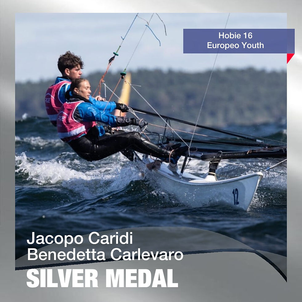 Alle loro spalle, Jacopo Caridi e Benedetta Carlevaro hanno conquistato un meritatissimo secondo posto con una performance grintosa e spettacolare. Rispetto ai loro compagni di squadra, hanno dimostrato di avere un passo eccezionale, collezionando il maggior numero di vittorie di tutta la flotta: ben quattro primi posti. Hanno lottato con determinazione in ogni prova, superando anche una difficile squalifica (DSQ) nella regata numero 8, che fortunatamente hanno potuto scartare. Il loro finale di campionato è stato potente, con due vittorie nelle ultime quattro prove, a sigillare un argento che vale oro e che completa un podio quasi interamente tinto d'azzurro.